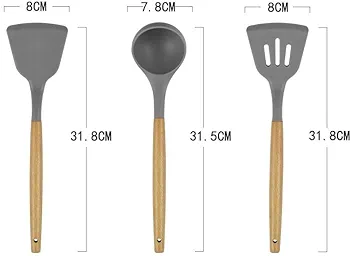 Non-Stick Silicon Spoon Set with Wooden Handle (Grey, 3 Pc)